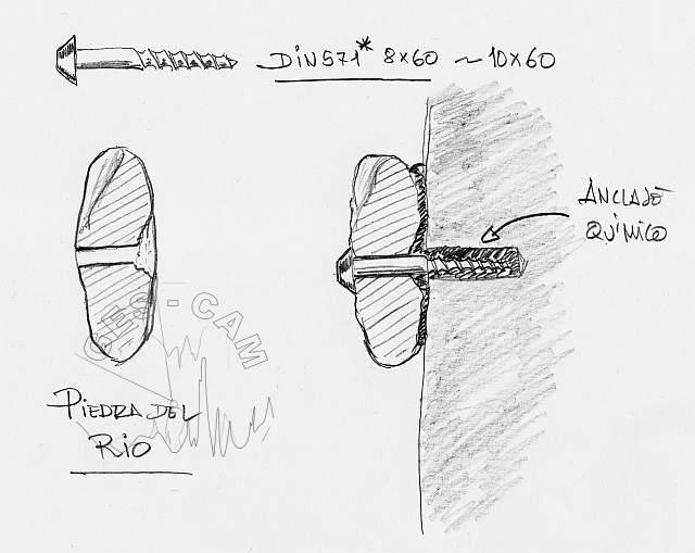 Esta vez emplearemos una estrategia que nos permita eludir los inconvenientes ya mencionados. Recurriremos a un anclaje químico, que no somete a la piedra a tensiones y a un tornillo tipo DIN 571 con la cabeza torneada para que no presente aristas agudas.