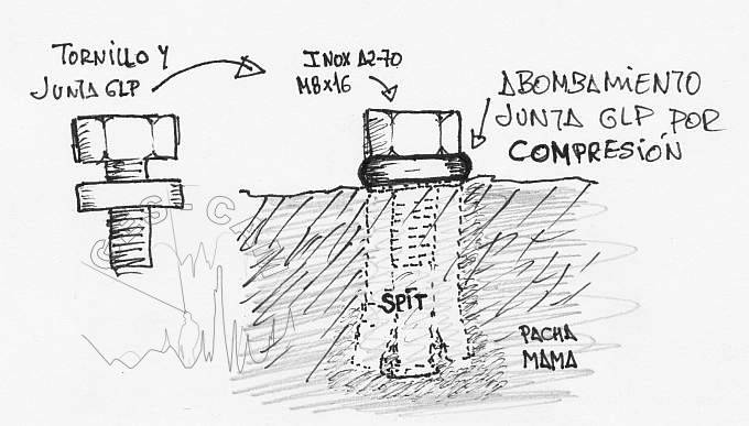 En algunos casos, por escasez de material, hemos colocado solo el tornillo, pero la junta de goma es conveniente, por que evita la entrada del agua. Las juntas que veníamos empleando con los tornillos cincados de M8x10 resultan un poco cortas con los tornillos inox -mas largos- y se nos presentaban dudas en cuanto a su eficacia para “sellar” la entrada del spit.