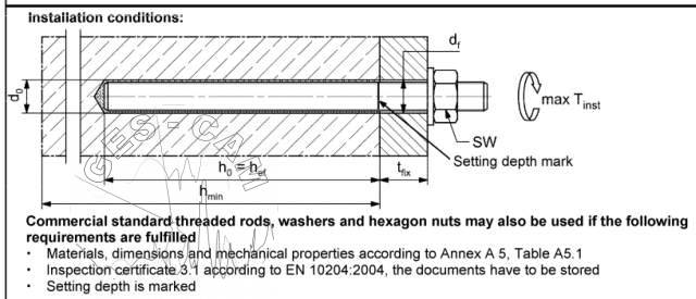 En esta ilustración vemos el sistema típico de montaje de un anclaje empleando un espárrago roscado tal como se indica en el datasheet del fabricante. El espárrago queda embutido en la pared y la tuerca permite fijar luego las piezas al anclaje. Si la ilustración no nos resulta suficientemente explícita, tal vez lo veamos las claro en la siguiente fotografía: