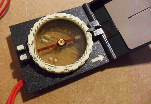 La brújula anterior en posición de tomar acimuts, con la aliada correctamente desplegada y la lupa para ver la escala de grados: