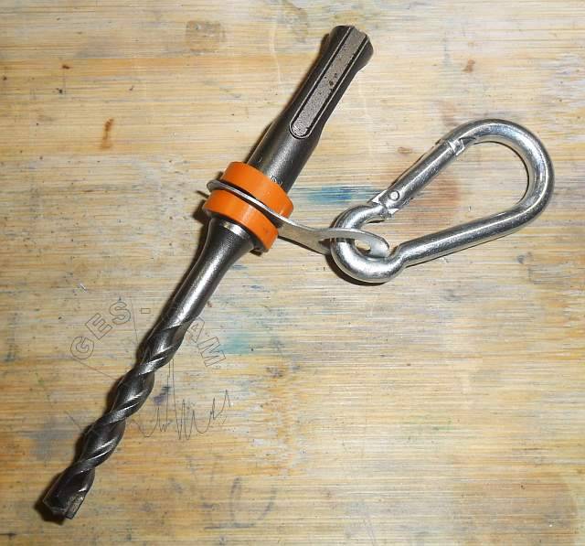 Pasamos el culete de la broca por el agujero agrandado en el fleje y, para evitar que se salga, colocamos una anilla a cada lado, como se ve en la foto. Debemos permitir que el fleje gire libremente, así podemos taladrar y realizar cambios de brocas sin desengancharla en ningún momento.