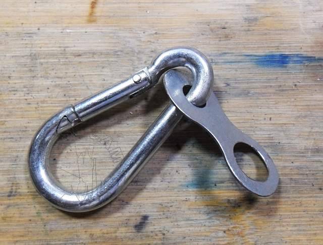 …una anilla metálica, de esas que usamos para enganchar las llaves (¡las llaves de las cerraduras! ) , que con su generoso tamaño nos permitirá enganchar un mosquetón grandote de los buenos.