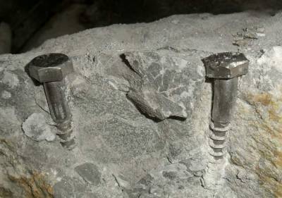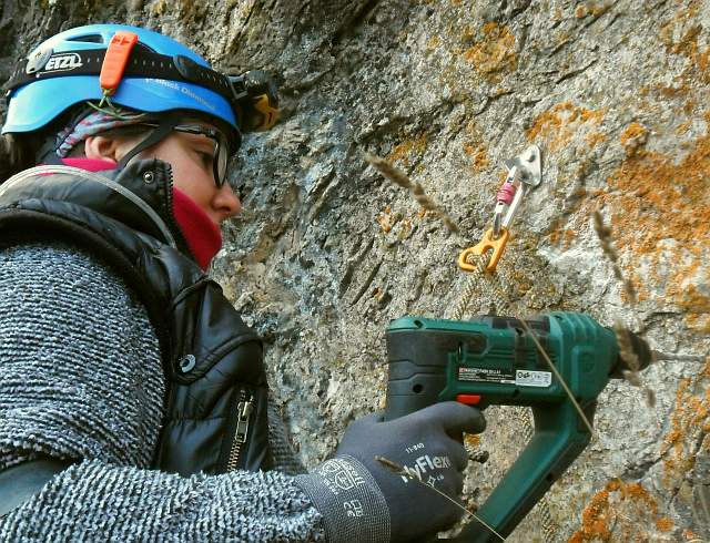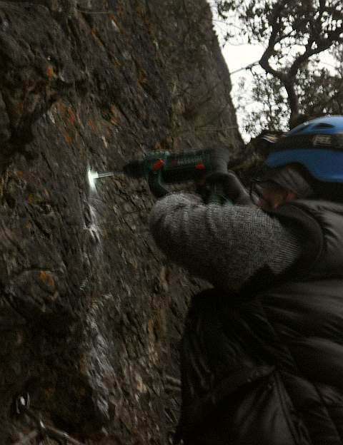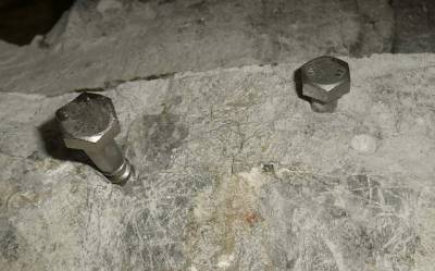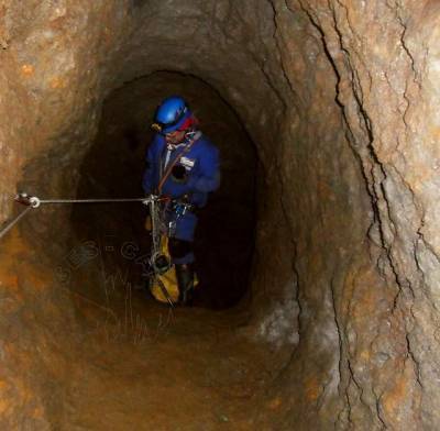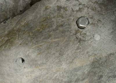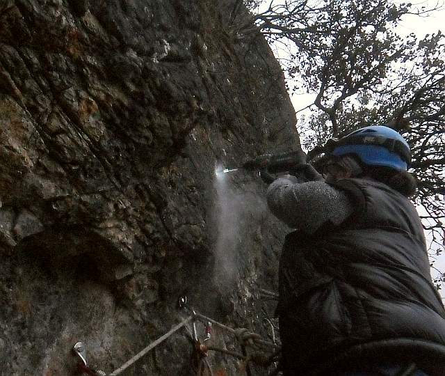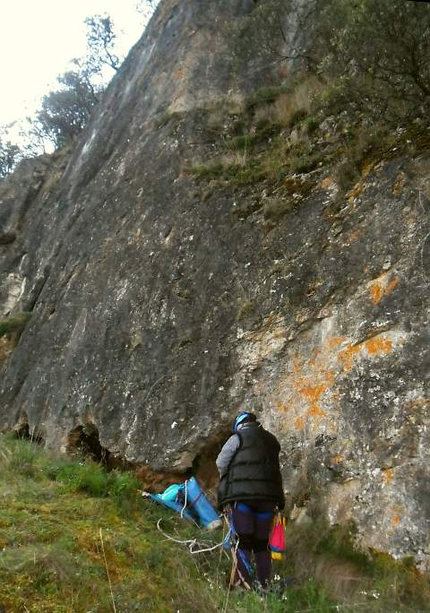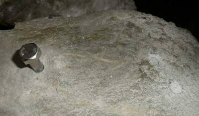 La instalación de un pasamanos de descenso a las galerías mineras nos planteó un interesante desafío… La calidad de la pared es tan mala, una amalgama de esquistos y arcillas con una consistencia mas próxima a la plastilina que a la roca, que cuando intentas colocar un spit te ocurre esto:
