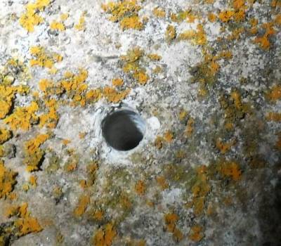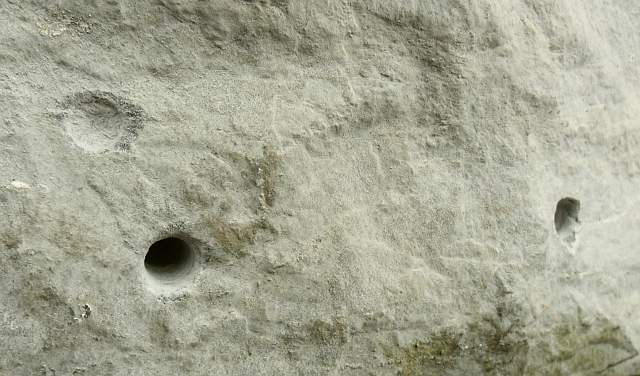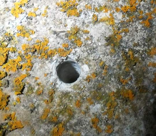 Sobre cada bloque calizo realizamos dos agujeros, de 6 y 7 mm. de diámetro respectivamente. En las fotos el agujero de 7 mm. de diámetro está marcado con un punto de taladro al lado.