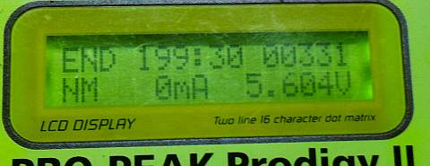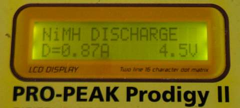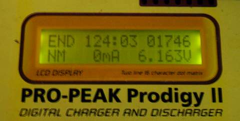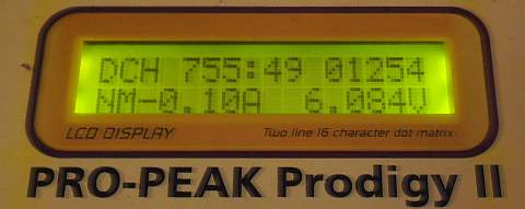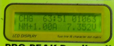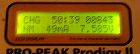 Se ha cargado el pack usando su cargador original. El cargador original realiza la carga a 0,5C, con lo que en un par de horas aproximadamente el pack está cargado, indicándolo el cargador mediante un LED verde (durante el proceso de carga el LED es rojo).