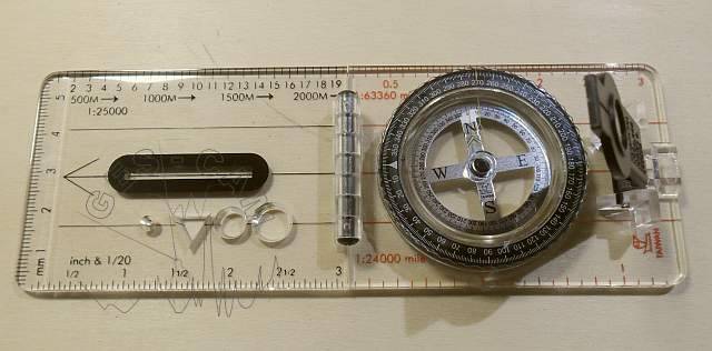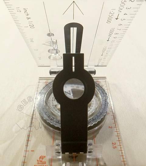 La brújula anterior en posición de tomar acimuts, con la aliada correctamente desplegada y la lupa para ver la escala de grados: