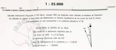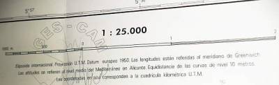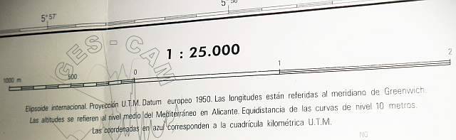 Las escalas mas habituales que podemos encontrar en los mapas publicados por el IGN1) son: 1:25.000; 1:50.000; 1:100.000; 1:250.000, etc. La escala 1:25.000, por ejemplo, significa que cada unidad de medida sobre el mapa representa 25.000 unidades sobre el terreno. Las unidades pueden ser mm, cm, dm, etc. Es decir 1 cm sobre el mapa equivale a 25.000 cm sobre el terreno. Si convertimos los 25.000 cm del terreno a metros, veremos que son 250 m. Recapitulemos: 1 cm sobre el mapa equivale a 250 m sobre el terreno, o lo que es lo mismo, 4 cm sobre el mapa equivalen a una distancia de 1 km sobre el terreno. Así es mas fácil de recordar (¡pero solo para mapas a a escala 1:25.000!)