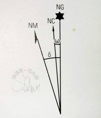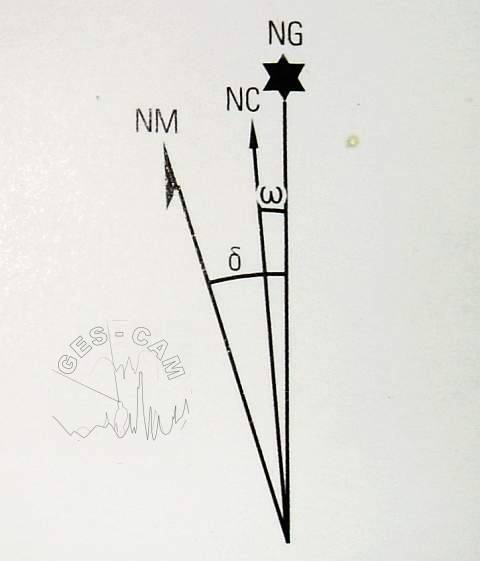 El norte que podemos estimar con la brújula es el Norte Magnético (NM) y es diferente del Norte Geográfico (NG). La diferencia entre ambos se llama declinación magnética. Se mide en grados sexagesimales, es diferente según la zona geográfica y su valor cambia de un año para otro. En la leyenda del mapa se indica el valor de la declinación (la diferencia entre el NM y el NG) para el año de publicación del mapa y cuanto va cambiando cada año. Esos datos nos permiten estimar la declinación actual para el área geográfica representada en el mapa.