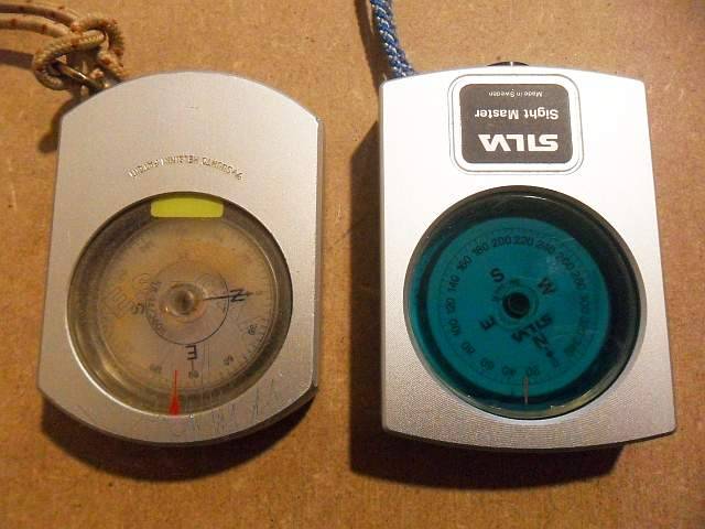 Y esta es una típica brújula de marcha, del fabricante K&R, con caja protectora y espejo para tomar acimuts: