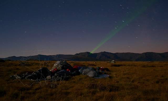 Todos duermen ya. Aprovecho entonces para realizar unas fotos del campamento bajo el claro de luna, con las cumbres de las Trevincas como telón de fondo a lo lejos. Algun piloto con aparente dificultad para estabilizar el rumbo, y un rayo misterioso proveniente de las lejanas montañas quedan también registrados por la cámara.