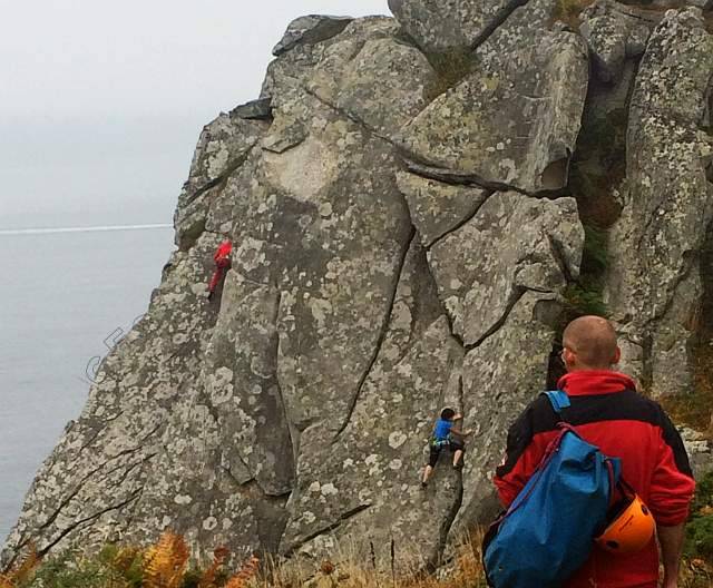 El puente de Agosto, que estábamos por la zona del Morrazo, nos acercamos el Lunes 15 hasta la zona de escalada de Donón, o Hío, con los amigos escaladores del CAM, para practicar un poco de Frist.