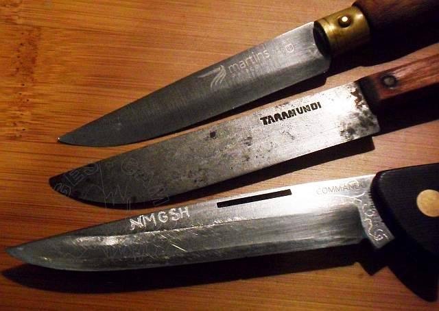En esta foto podemos ver, de arriba a abajo, un excelente cuchillo de cocina Martins, en madera,broce amarilo, acero inoxidable 420… y nada de plástico . Justo debajo un cuchilo de acero mixto al carbono forjado artesanalmente en Taramundi, con un filo capaz de cortar la respiración. Este no es inoxidable, como se puede apreciar en la pátina corrosiva sobre la hoja. Y al final la excelente hoja inoxidable, pre-Pielcu, de la Aitor Commando que tan buenos servicios me ha prestado. Tres ejemplos de acero, inoxidables o no, que son atraidos por el imán.