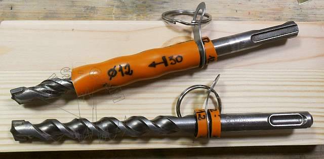 Veamos ahora las brocas SDS con mas atención. Son dos brocas de 12 mm, mosquetoneables, una para instalar químicos M10 y la otra acondicionada para instalar spits.