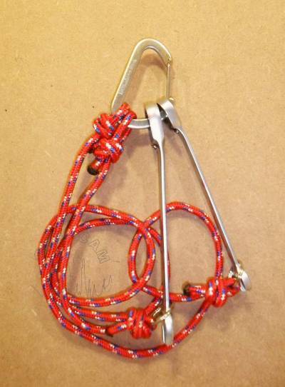 Esta es la disposición que empleo ahora normalmente en el arnés. Me resulta muy cómodo enganchar y desenganchar la llave correspondiente del mosquetón, sin importar cual de ellas esté primero.