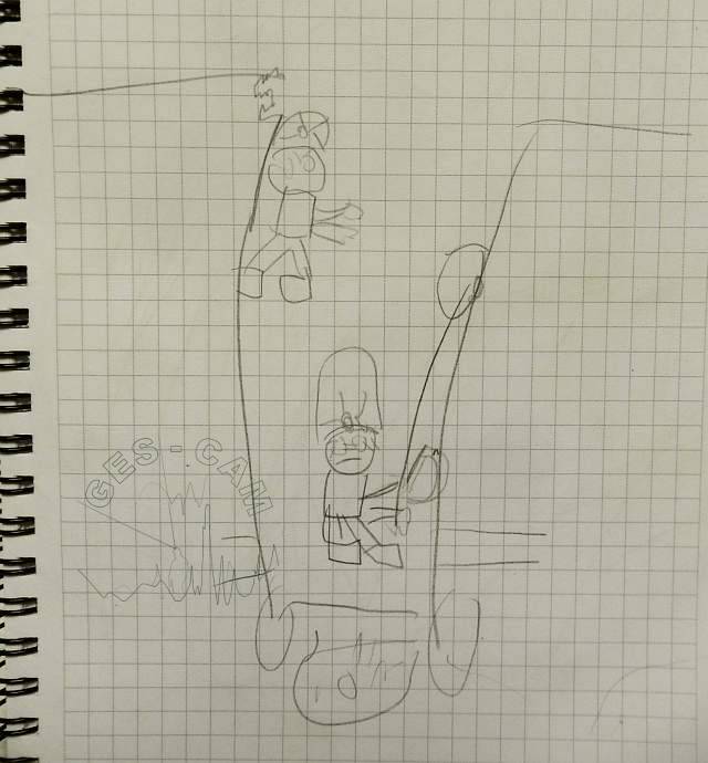 En tanto Bea prepara la instalacion de descenso, los chicos se ocupan de realizar la topo de la sala principal.