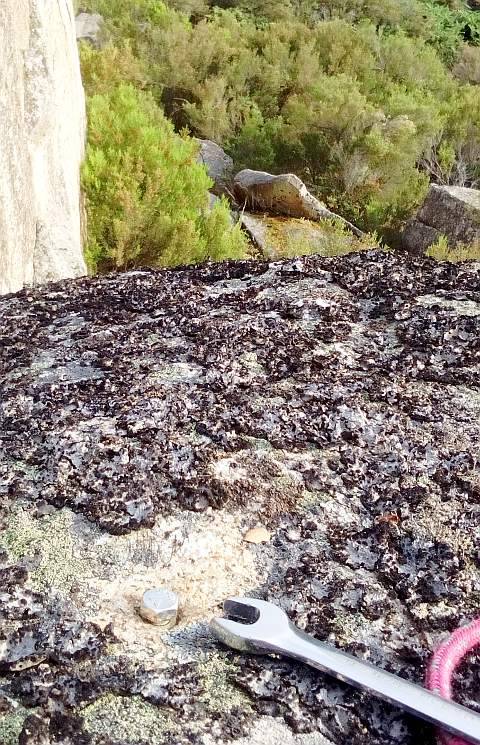 Poco a poco hemos ido reemplazando los primeros tornillos cincados por equivalentes inoxidables M8x16 en A2-70 como podemos ver en esta entrada. El empleo de los nuevos tornillos, ademas de mejorar la protección del spit, permite emplear el propio tornillo -por su mayor longitud y resistencia- como elemento de anclaje, por ejemplo con plaquetas recuperables.
