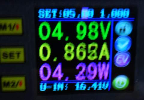 Por debajo de 5 voltios de alimentación el regulador ya no es capaz de proporcionar correctamente la energía al LED y la linterna pasa a modo emergencia. Este modo se mantiene hasta algo menos de 4,5 voltios. Por debajo de esta tensión de alimentación el regulador corta la alimentación.