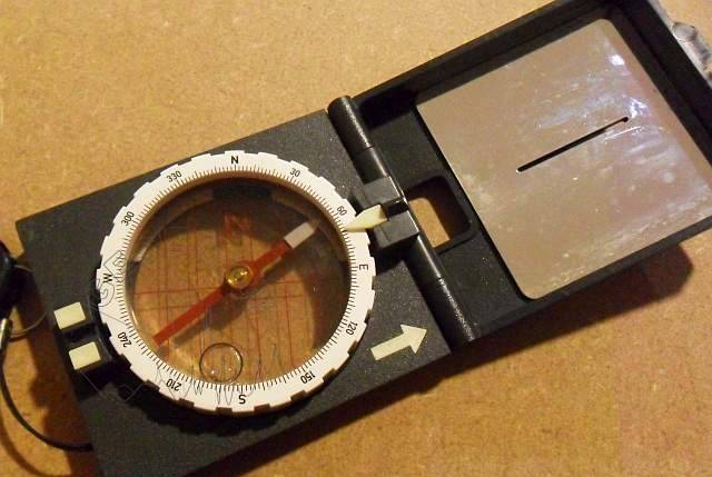 La brújula anterior en posición de tomar acimuts, con la aliada correctamente desplegada y la lupa para ver la escala de grados: