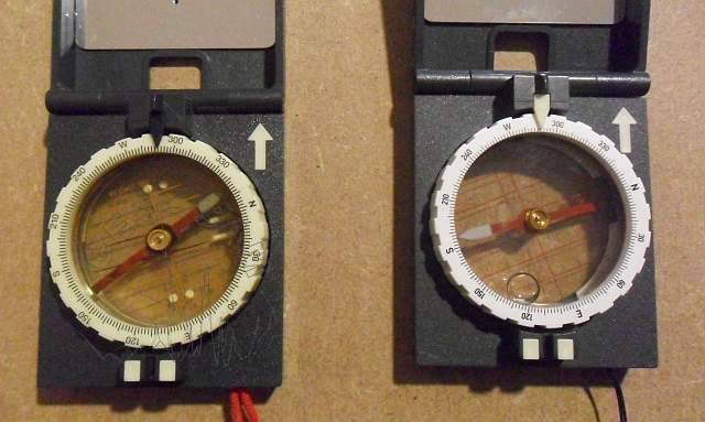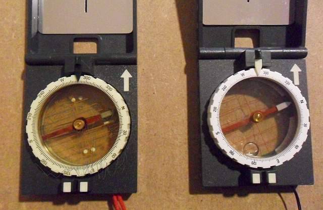 Y esta es una típica brújula de marcha, del fabricante K&R, con caja protectora y espejo para tomar acimuts: