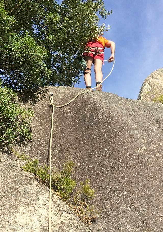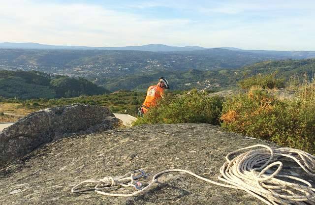 El día amaneció nublado pero a la hora acordada para reunirnos estaba una tarde estupenda, calorcillo pero sin agobiar. Esta vez aparcamos en una zona que yo, personalmente aun no conocía y nos adentramos en la maleza, retruécanos, los toxos como pinchaban!! Llegamos a la zona que queda a la derecha del penedo en el que ya tenía estado otras veces con los compis, esta piedra es nueva para mi y tuve que agudizar la vista para encontrar los tornillos de los spits (se encontraban bien ya que estaban oxidados). Primero comprobamos que los spits estuvieran en buen estado e instalamos la cabecera para seguir bajando y comprobando los siguientes fraccionamientos.