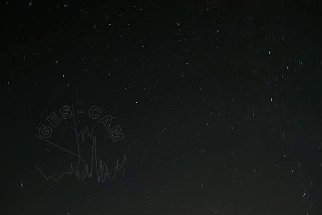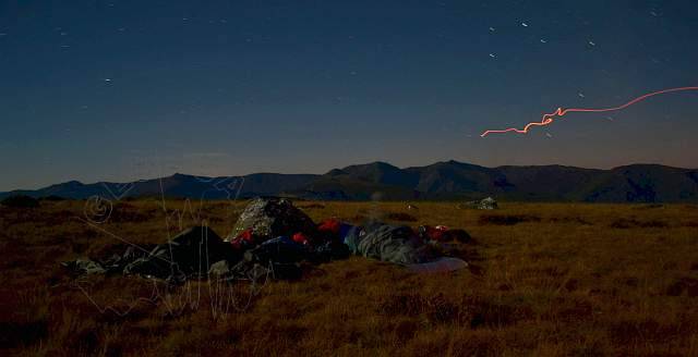Todos duermen ya. Aprovecho entonces para realizar unas fotos del campamento bajo el claro de luna, con las cumbres de las Trevincas como telón de fondo a lo lejos. Algun piloto con aparente dificultad para estabilizar el rumbo, y un rayo misterioso proveniente de las lejanas montañas quedan también registrados por la cámara.