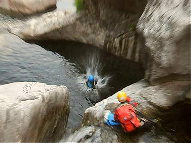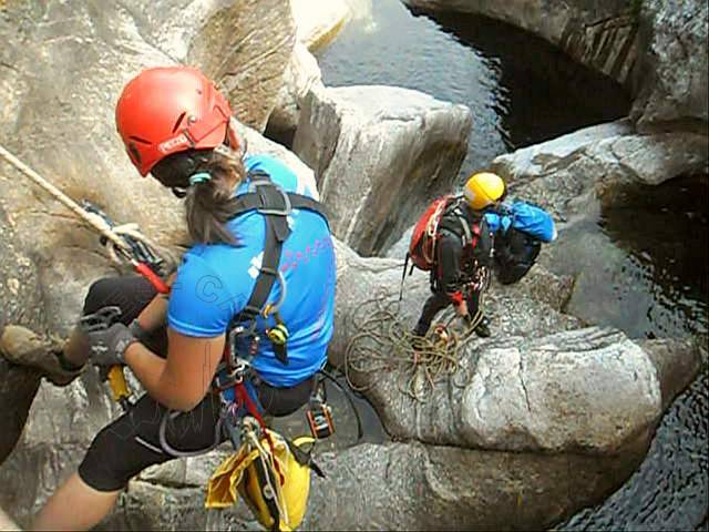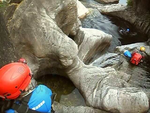 En torno a las marmitas, la roca, pulida por el agua, ofrece una adherencia aceptable cuando está seca. Mojada se convierte en una verdadera pista de patinaje, de modo que ¡atención!.