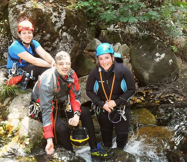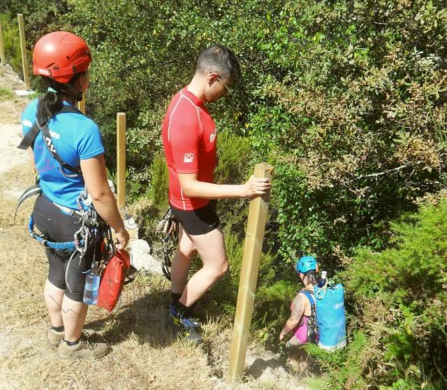 Bea y Moncho descubren una instalación previa para descender a la primera marmita, en la margen derecha de la cascada, y aprovechan para tantear los saltos.